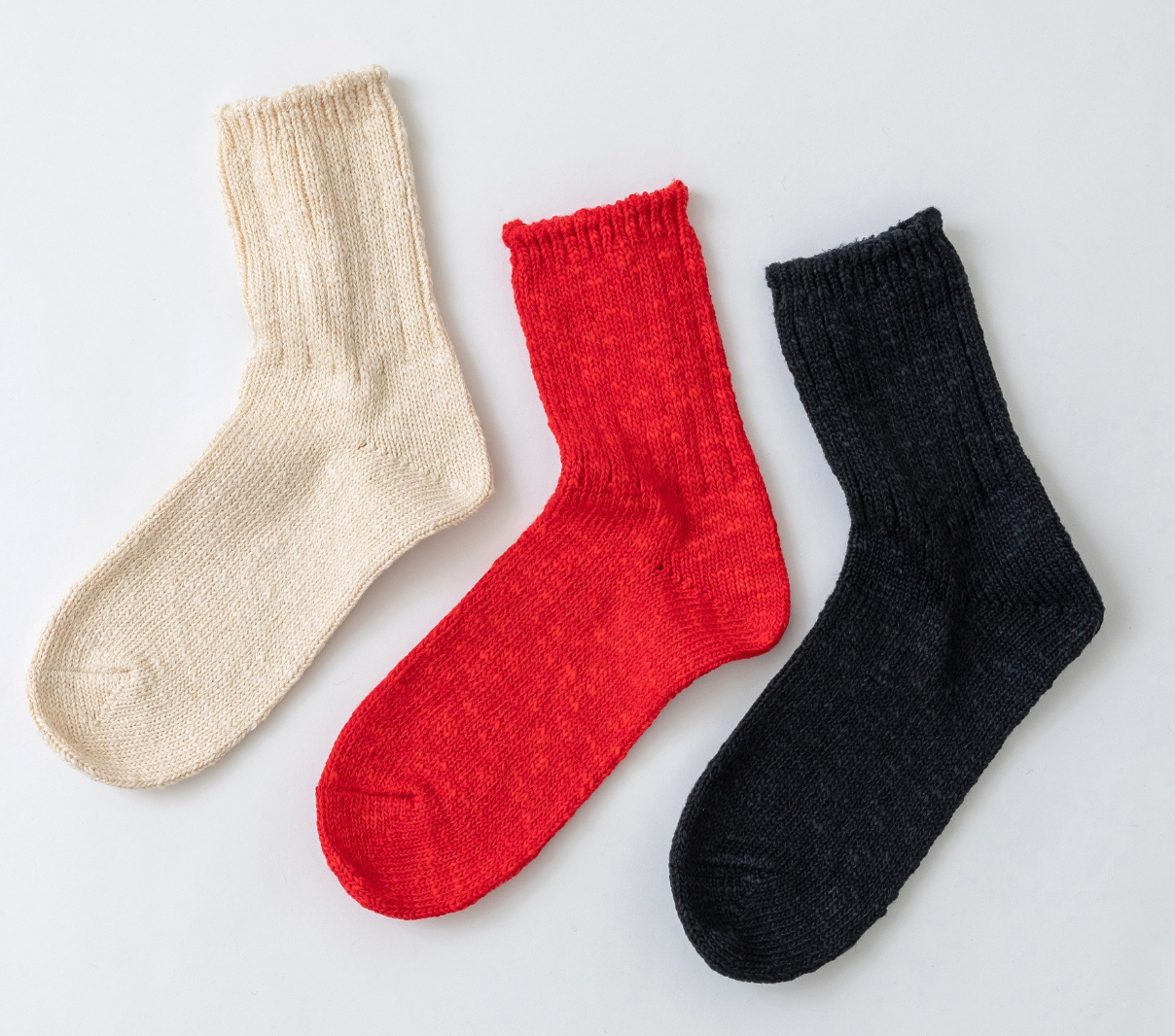 Upcycled cotton/slub mix socks are knitted by crossing three types of cotton yarns: slub yarns of irregular thickness, recycled cotton yarns made from fallen wadding from spinning yarns at spinning factories in Japan, and combed cotton yarns, which are softer and more textured among cotton yarns.
